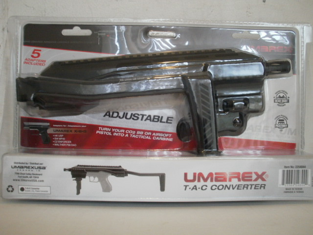 The Umarex T.A.C. Converter Kit can convert Fits these airsoft Pistols, The HK USP (airsoft and BB gun), S&W MP40 BB gun, Umarex XBG BB gun, Combat Zone Enforcer airsoft gun and Walther P99 DAO airsoft gun. This is One of the coolest tools to hit the market, this tactical pistol conversion kit takes your handguns to a whole new level! For airsoft players, you'll get more control over your pistols and gain some rails for adding optics, lasers and flashlights. You'll have an edge over the other team by getting more hits due to the added stability. Attach your CO2 BB pistol to this converter, and you'll give yourself more control for target shooting and plinking. In fact, if you find that it isn't easy to shoot pistols accurately, this converter may give you an advantage and deliver better accuracy. The T.A.C. converter Converts some airsoft and BB pistols to carbines*, Folding grip and stock, Removable foreward grip, Fixed front blade sight, Windage-adjustable rear sight, Long Weaver/Picatinny rail on top, 3 short Weaver/Picatinny rails (one of the rails is for the detachable forward grip), Overall length is 14" to 22.50", This Airsoftlegion package Includes 1 x Umarex T.A.C. Converter, 4 x adapters 1 x manual.